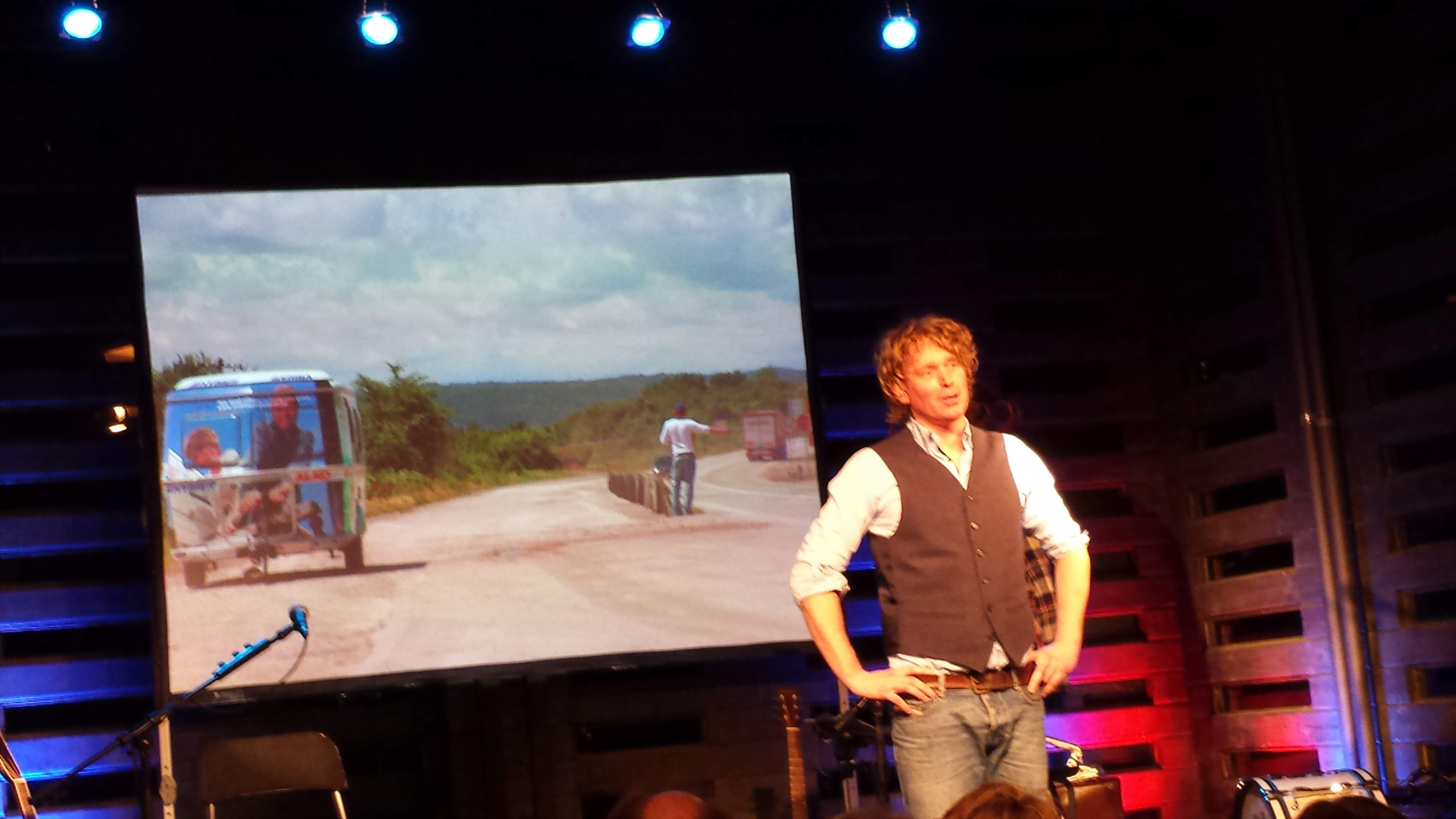 Tjerk Ridder tut das seit einiger Zeit auch mittels eines multimedialen Bühnenprogramms. Nun stand es auf dem Programm vom Herman-van-Veen-Artscenter. Warmes Licht empfängt die Zuschauer, die auf transparenten Plastiksesseln im Innern der „Kunstscheune“ platzgenommen haben. Alle Plätze sind besetzt. Auf die Leinwand ist das Coverfoto des Buches „Trekhaak Gezocht!“ projiziert. Es zeigt den Wohnwagen und Tjerk Ridder, welcher an einer Chaussee die Hand trampen ausgestreckt hat.