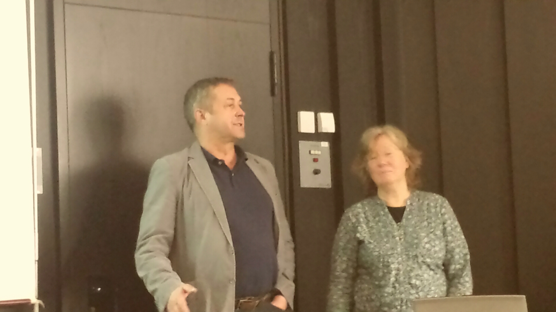 Der Geschäftsführer des neuen deutschland, Olaf Koppe, begrüßt die Mittelostkorrespondentin Karin Leukefeld; Foto: C.-D.Stille