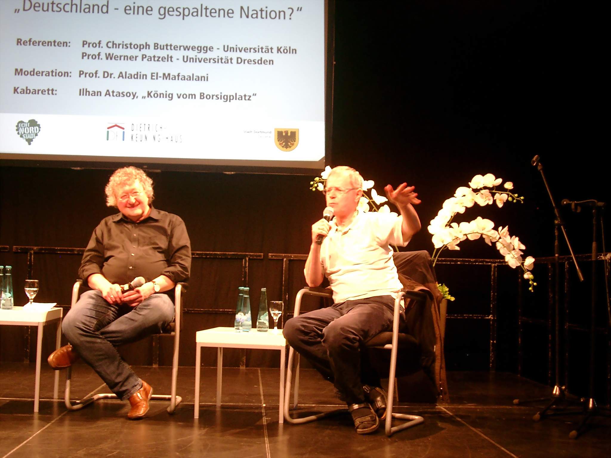 Eingeladen waren die beiden renommierten Politikwissenschaftler Prof. Christoph Butterwegge (Universität zu Köln) und Prof. Werner Patzelt (Universität Dresden). Für Unterhaltung kabarettistischer Natur sorgte der Dortmunder Kabarettist Ilhan Atasoy („König vom Borsigplatz“).