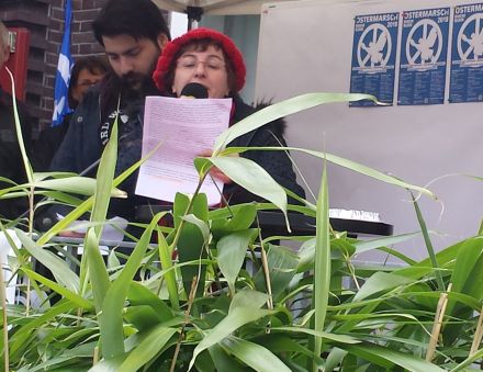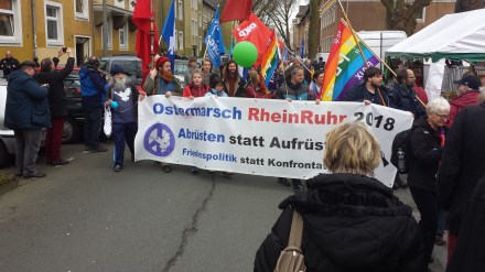 Hinweis:  Auf NRWision gibt es einen Film von Klaus Brönies, worin der Ostermarsch Rhein Ruhr 2018 dokumentiert ist. Ab 38:10 Min.  sehen und hören Sie die Rede von  Willi Hoffmeister (Ostermarsch-Koordinator) und ab 41:50 Min.  die von Anja Weber (Vors. DGB Bezirk NRW).