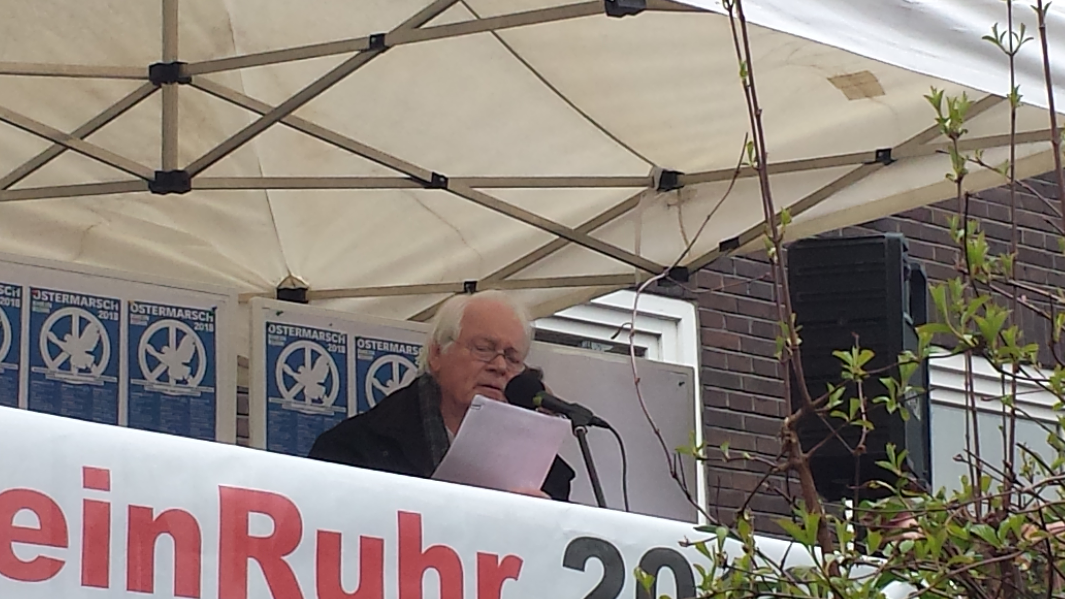 Der Ostermarsch Ruhr 2018 fand am Ostermontag am Wichernhaus in der Dortmunder Nordstadt seinen Abschluss. Dort sprach zunächst Willi Hoffmeister, das „Urgestein der Dortmunder Friedensbewegung“, zu den Ostermarschierern. Hoffmeister, der erst kürzlich seinen 85. Geburtstag begehen konnte, konnte abermals eine Steigerung der Teilnehmerzahlen des Ostermarsches verkünden. Sie wurden diesmal mit 2300 Teilnehmern angeben. Was gewiss auch Reaktionen darauf sind, dass gegenwärtig wieder Kriegsszenarien ins Werk gesetzt werden. Und die Bundesregierung den Militärhaushalt um zwei Prozent der Wirtschaftsleistung zu erhöhen gedenkt.