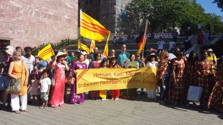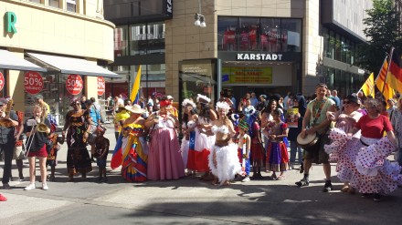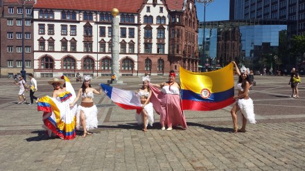 Zu einem Höhepunkt auch des diesjährigen Festivals gestaltete sich die „Parade der Vielfalt“. Sie eröffnete das dreitägige Festival am vergangenen Freitag. DortmunderInnen mit oder ohne Migrationshintergrund, sowie Gäste der Stadt, fanden sich als bunte Truppe, darunter auch Kinder, bekleidet mit phantasievollen und traditionellen Kostümen und Gewändern am Freitagnachmittag auf dem Friedensplatz vor dem Rathaus ein und präsentierten sich zu Trommelklängen auf dessen Treppe mit Blick auf die Friedenssäule. Bürgermeisterin Birgit Jörder war zum Empfang der Parade erschienen. Dann starteten die Menschen zur „Parade der Vielfalt“, angeführt von der Formation Schwarz-Rot Atemgold 09 sowie anderen Musikern, ihren Marsch durch die Stadt. Es ging hinunter in die Stadt über den Westenhellweg zur Kampstraße. Unmittelbar an der Fußgängerzone wurde ein Kreis gebildet. Bei Blasmusik und zu leidenschaftlichen Trommelklängen und zu heißen Rhythmen tanzten kolumbianische Frauen leidenschaftlich und verkörperten, natürliche ungebremste Lebensfreude. Tamilische Kinder in ihren schönen Trachten und dem Schmuck im Gesicht eroberten die Herzen Menschen.