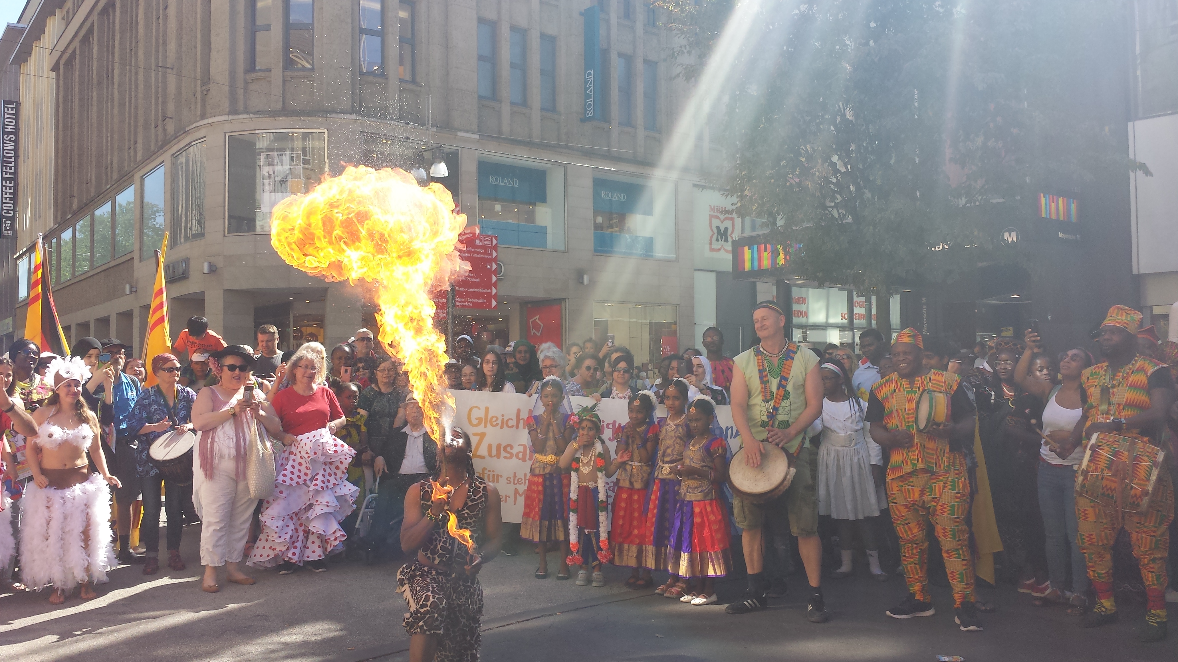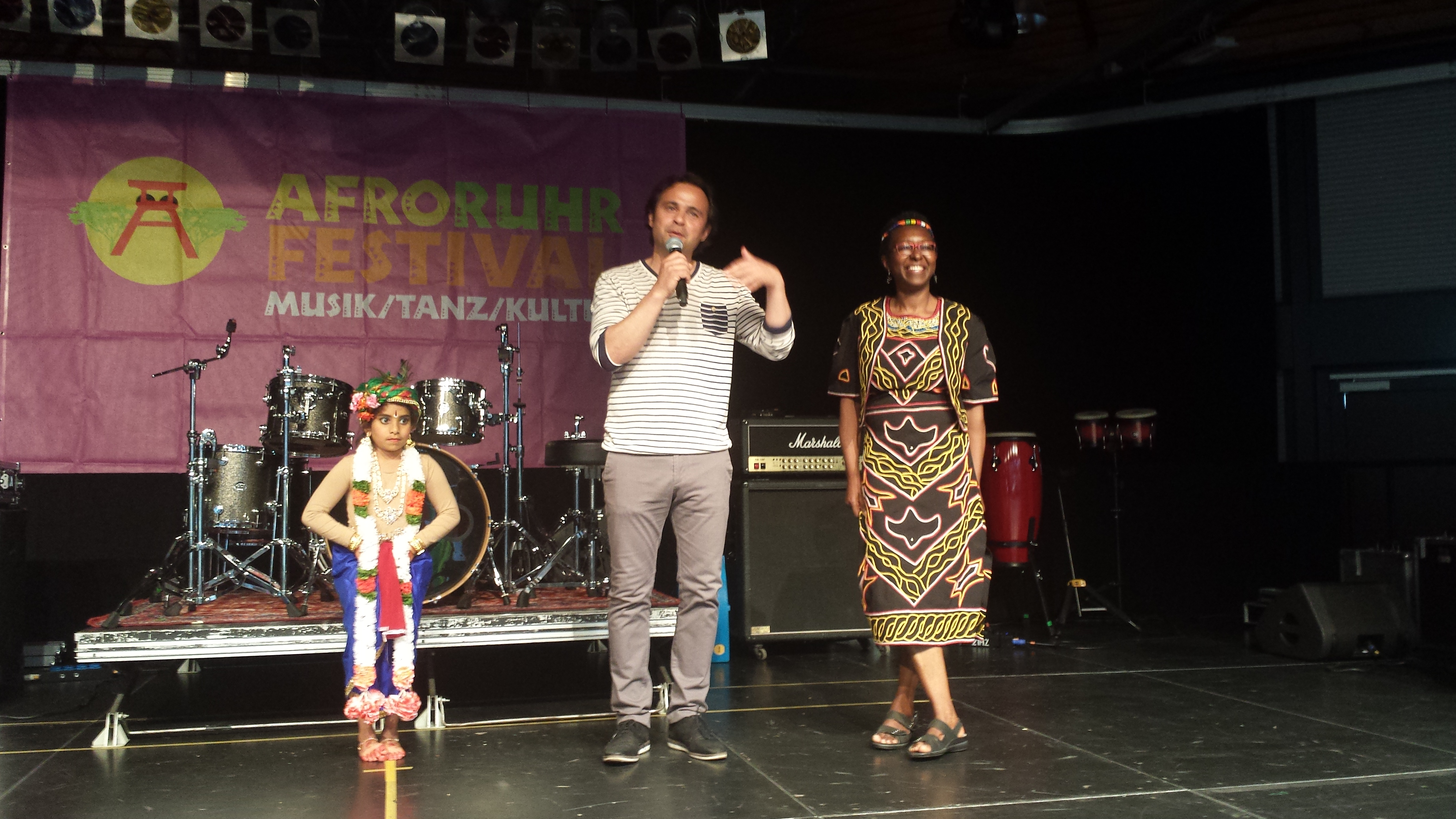 Dort eröffneten Veye Tatah und Levent Arslan – sie hatten ebenfalls an der Parade teilgenommen – gemeinsam feierlich das 10. Afrika Ruhr Festival, das eine einzigartige Begegnungsplattform für möglichst viele unterschiedliche Menschen, sein will. Eine Kindergruppe eines tamilischen Vereins eröffnete das Programm. Musik und Tanzgruppen aus Europa, Afrika, Lateinamerika sowie Asien