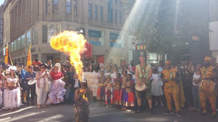 Ein Feuerspucker war das absolute absolute Highlight bei diesem Stopp der Parade. Dann ging es weiter über die Kampstraße und die Katharinentreppe hinab. Auf dem Platz davor gab es abermals ein Halt mit Tanz- und Musikdarbietungen, welche die Passanten neugierig machten. Dann zog die „Parade der Vielfalt“ unter wolkenlosem Himmel und bei brütender Hitze – die Menschen im Pulk schon von weitem als knallbunte Tupfer sichtbar – in die Gefilde der Nordstadt ein, um schließlich den Festivalort, das DKH, zu erreichen.