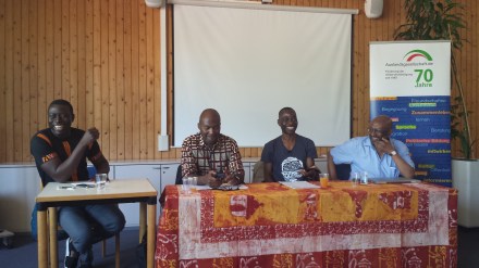 Moderator, Dr. Bonface Mabanza Bambu, Martial Ze Belinga und Dr. Dereje Alemayyehu (v.l.)