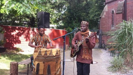 Urbain N’Dakon, Jahrgang 64, hat in der Elfenbeinküste Germanistik studiert und war dort einige Jahre als Gymnasiallehrer für Deutsch und als Berufsberater tätig. Der Sohn einer Hobbysängerin und eines Sportlehrers hatte die Musik immer als Hobby gepflegt, ehe er 1993 nach Deutschland kam. Im Hauptberuf arbeitet Dr. Urbain N’Dakon, dieser außergewöhnliche, kluge Zeitgenosse, als Referent für Qualitätsentwicklung in der Jugendhilfe beim Caritasverband Fulda. Ein Glücksgriff, dass Urbain `N Dakon, den aus Togo stammendem Musiker Ablam Benjamin Akoutou, getroffen hat, welcher ihn einfühlsam auf unterschiedlichen Trommeln begleitete. Beide Musiker gaben noch einige Zugaben im Kirchgarten.