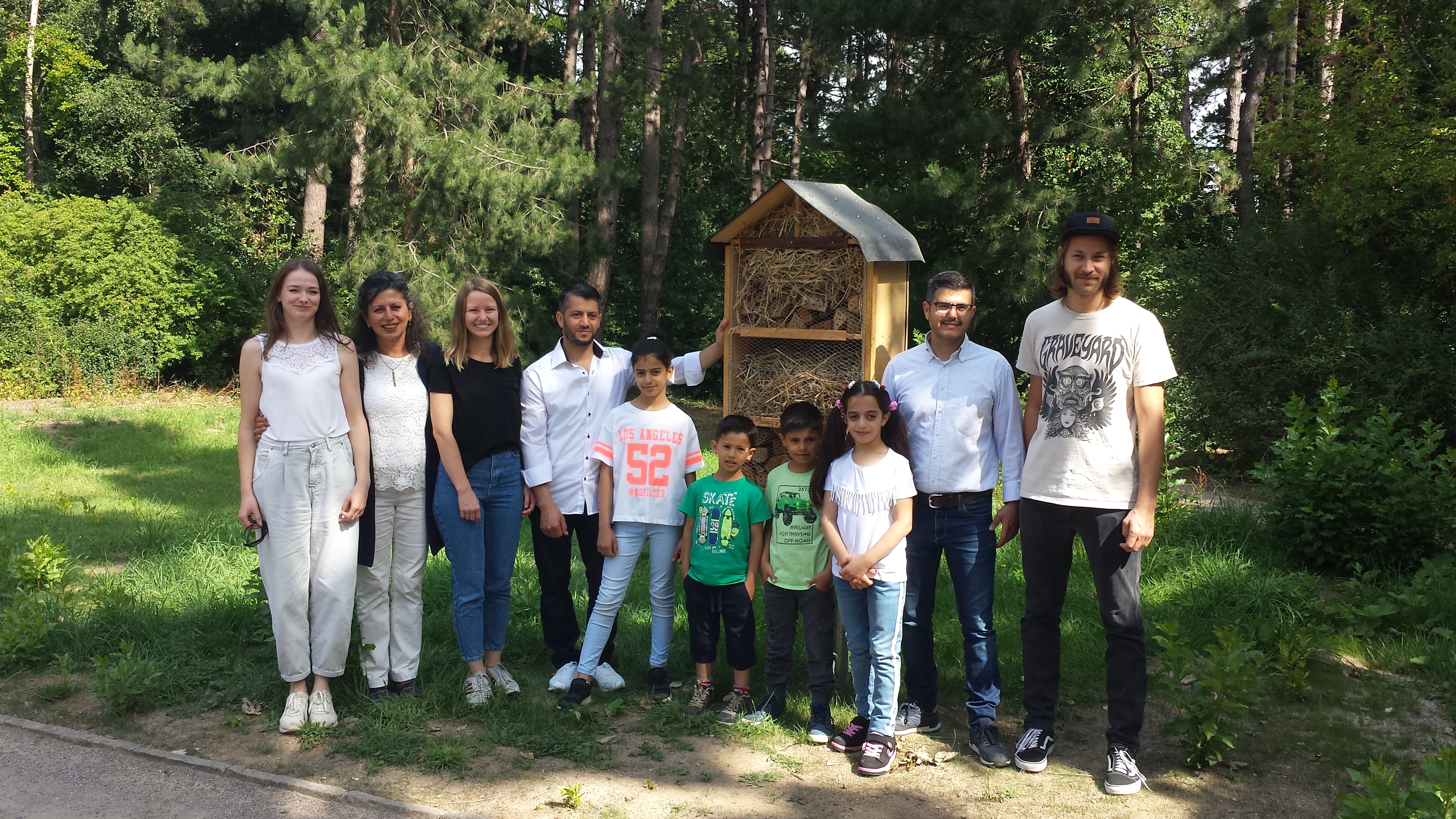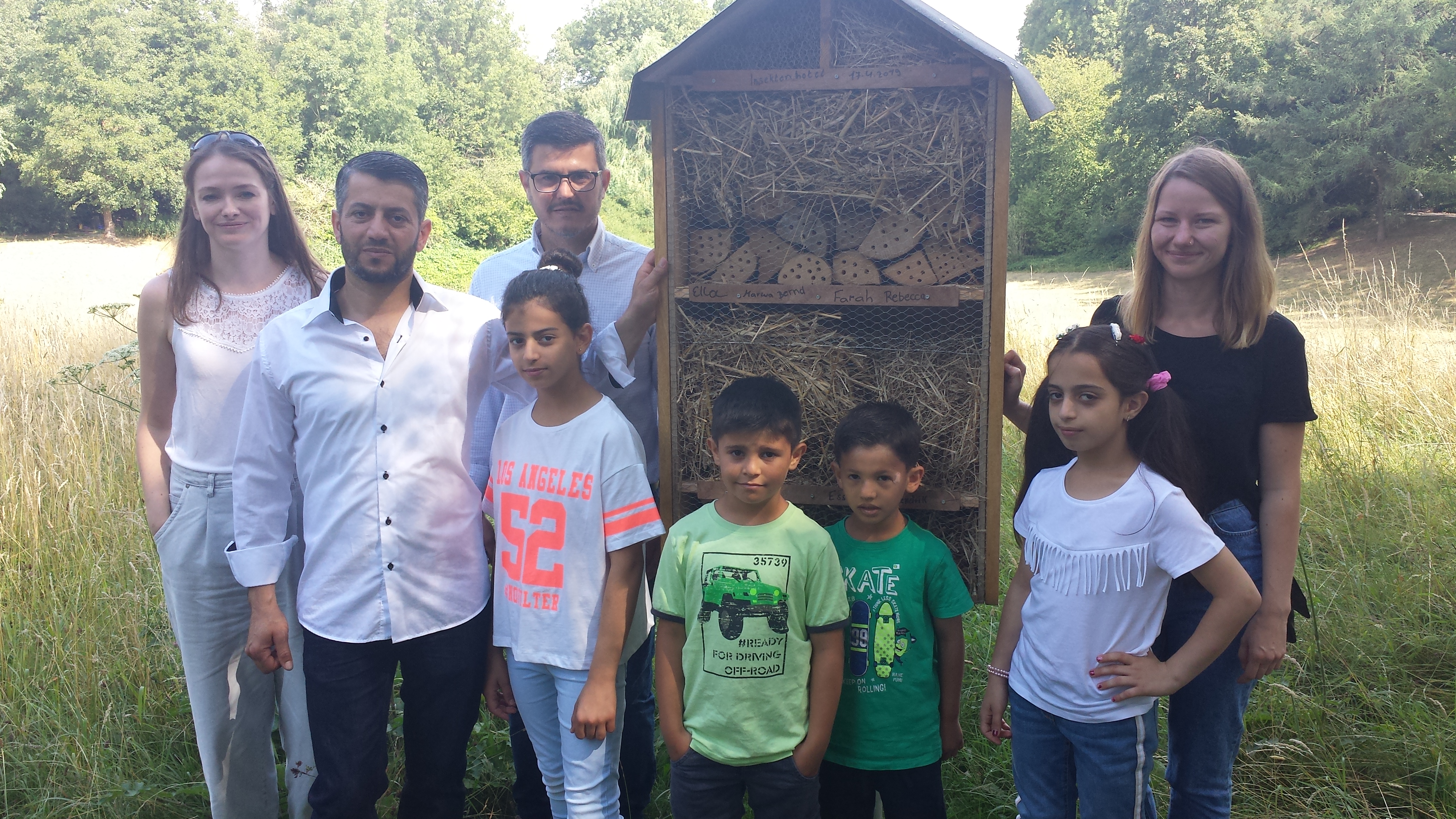 Vorm Insektenhotel. Ella Mönch, Nahid Farshi, Rebecca Dettling, Essam Alkuwaifi, Marwa Alkuwaifi, Abdullah Aldali, Ghazi Aldali, Farah Alkuwaifi, Tammam Aldali und Jendrik Herdemann (v.l.). Fotos: C. Stille
