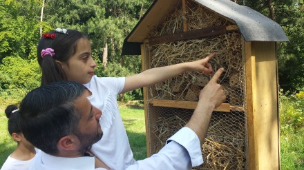 Geflüchtete Väter engagierten sich mit ihren Kindern gesellschaftlich beim Bau von Insektenhotels auf dem Hauptfriedhof Dortmund