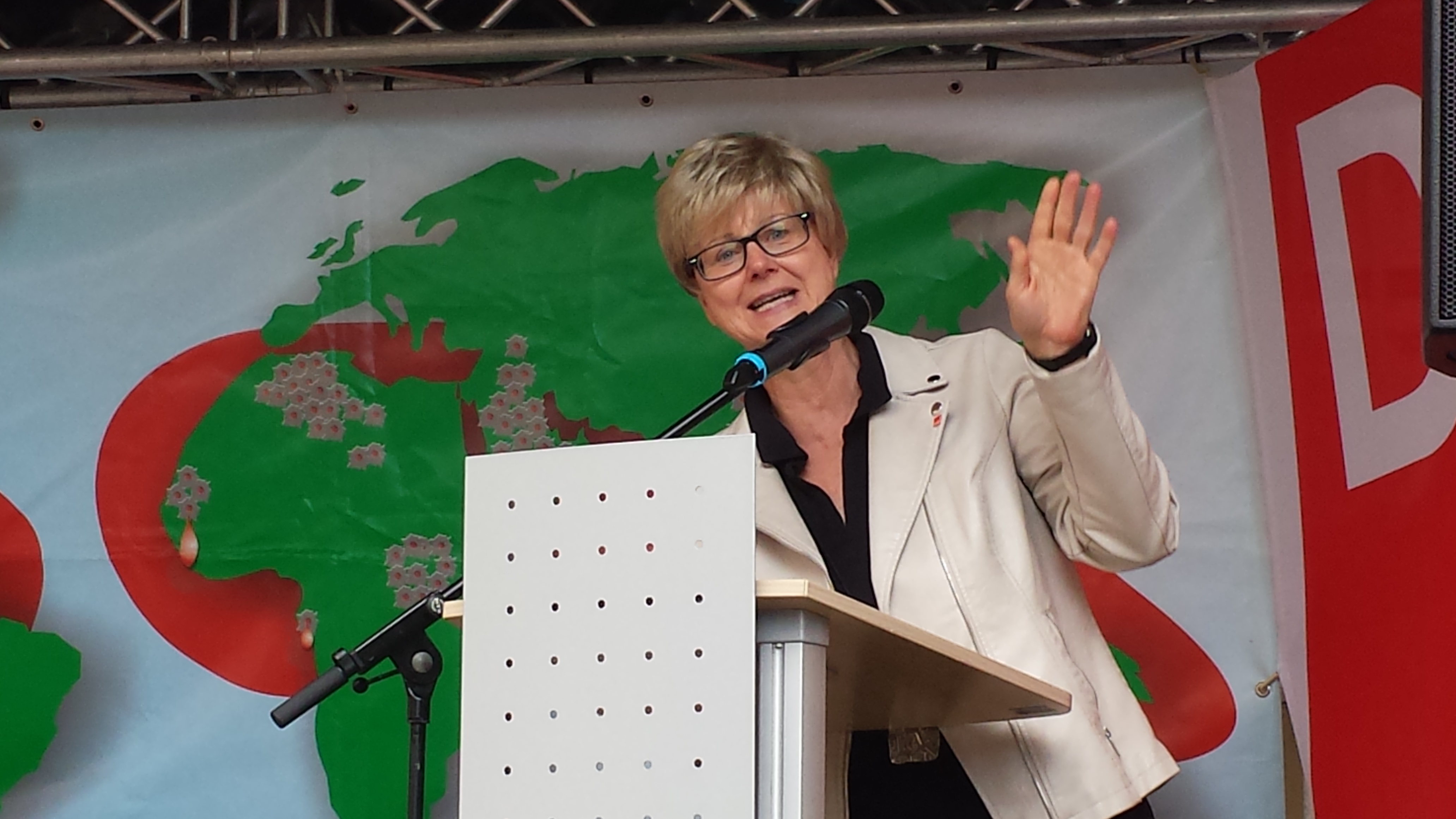 DGB-Vorsitzende Jutta Reiter: Krieg zerstört Lebensgrundlagen. Atomverbotsvertrag unterschreiben. Nein zum Zwei-Prozent-Ziel der NATO