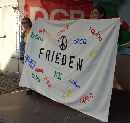 Charlotte Muche (der SJD – Die Falken) hielt im weiteren Verlaufe der Veranstaltung ein Plädoyer für den Frieden: „Frieden ist ein Welt ohne Faschismus, Rassismus und Sexismus. Frieden ist eine Welt ohne Hass. Frieden ist Freundschaft. Frieden ist Liebe. Frieden ist eine Welt wo die Bedürfnisse des einzelnen respektiert und geachtet werden. Frieden ist zusammenzuleben. Frieden ist Gleichberechtigung aller Menschen. Frieden ist Freiheit selbstbestimmt zu leben. Frieden ist die soziale Gleichberechtigung aller Menschen. Frieden ist, sich nicht über die Gemeinschaft zu stellen, Frieden ist Demokratie.“ (Auszug)