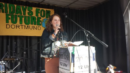 verkündet worden sei. Das sei kein ehrlicher Umgang mit Klimaschutz: „Wir fordern, dass ernsthaft über Klimaschutz landesweit – auch in Dortmund natürlich – gesprochen wird!“ Man erwarte, dass Unternehmen und Politiker gewissenhaft und mutig endlich in den Klimaschutz einsteigen. „Glaubten die Unternehmer und Politiker, wir lassen uns so einfach abspeisen?“ Politiker nähmen mittlerweile wohl das Wort „Klimaschutz“ in den Mund. Aber nur aus Angst, nicht wiedergewählt zu werden. Und die Unternehmen hätten Angst, dass ihnen die Konsumenten weglaufen. „Nutzt eure Macht, als BürgerInnen dieser Stadt, um Position zu beziehen! Nutzt eure Macht als Konsumenten, euch bewusst für Produkte oder gegen bestimmte Produkte zu entscheiden.