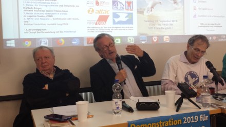 Die Kampagne „Abrüsten statt Aufrüsten“, regte Michael Müller an, solle ergänzt werden. Und zwar in der Form, dass das Geld was für die Aufrüstung im Bundeshaushalt geplant ist, für den Klimaschutz ausgegeben wird. Es werde überlegt, im nächsten Jahr einen gemeinsamen der Kirchen, der Friedensbewegung, der Umweltbewegung und Gewerkschaften zu machen – zu Thema Arbeit, Frieden, Klima. Damit solle auf den Zusammenhang dieser Themen aufmerksam gemacht werden. Es komme auf eine breite Basis an: „Sonst haben wir alle keine Chance.“