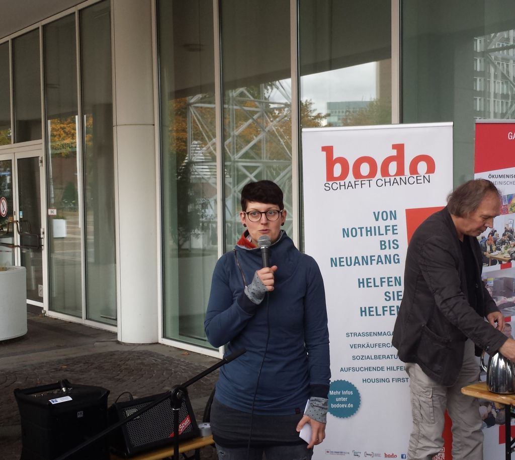 Alexandra Gehrhardt von bodo e.V. informierte die vorm Rathaus versammelten Menschen über die aktuelle Lage. Demnach gibt derzeit in Dortmund 1.400 Wohnungslose (die im Hilfesystem überhaupt ankommen), welche sich auf dem Markt keine Wohnung besorgen können. Alexandra Gehrhardt beklagte einen starken Anstieg der Wohnungslosen. Noch vor zwei Jahren seien es weniger als die Hälfte gewesen. Zum einen läge das an der Statistik, weil seit diesem Jahr auch geflüchtete Menschen in diese einflössen. Welche nach ihrer Anerkennung eigentlich eine Wohung haben müssten, sich aber am Wohnungsmarkt nicht versorgen können. Vor zwei Jahren seien das schon fast tausend gewesen. Nichtsdestotrotz müsse festgestellt werden, dass die Gesamtzahl der Wohnungslosen auch ohne die Flüchtlinge anwachse.