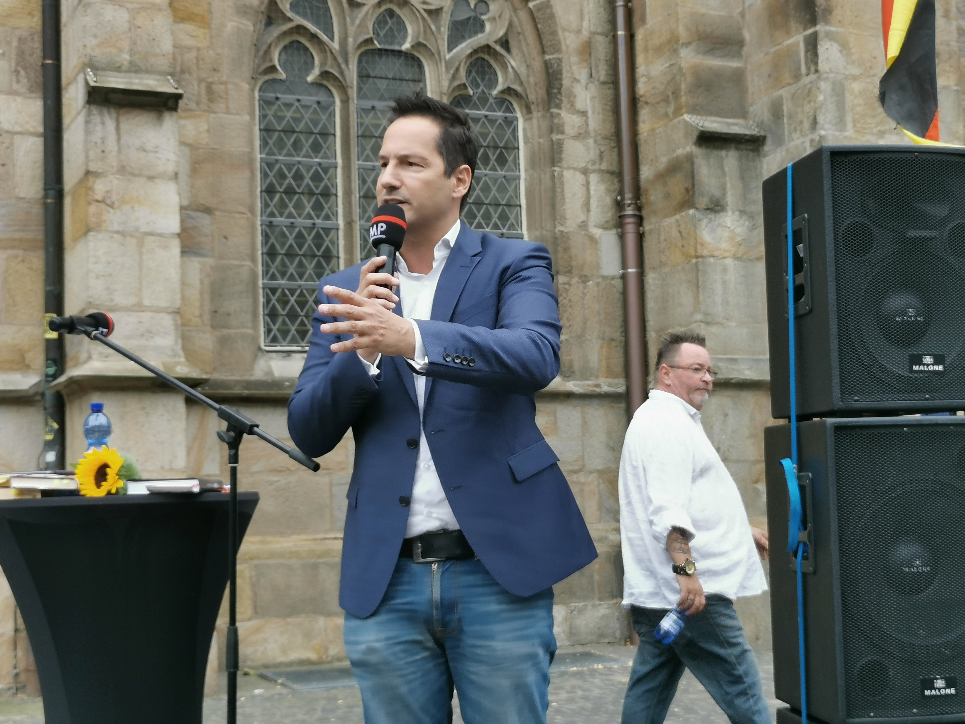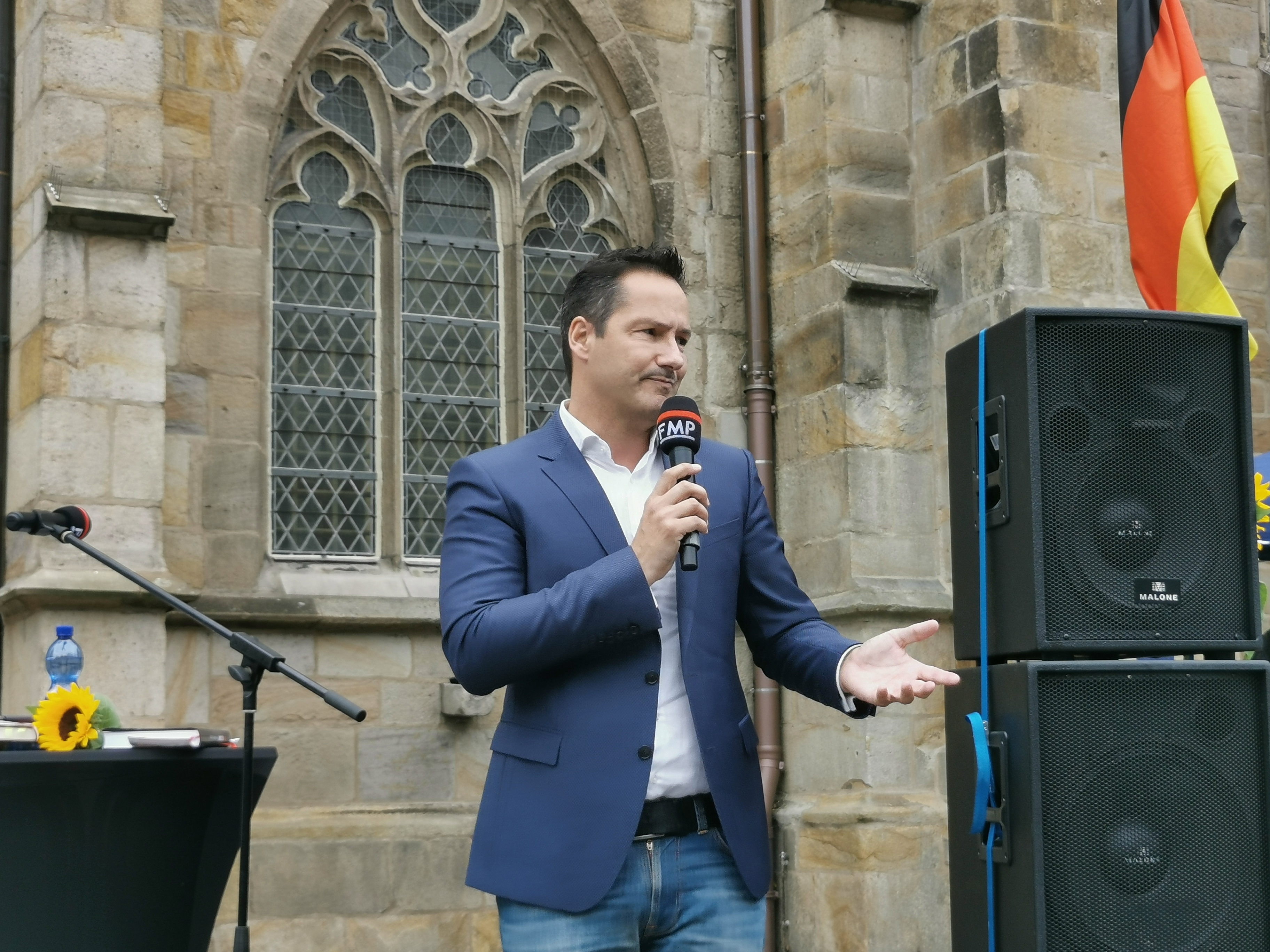 An einer Lautsprecherbox oberhalb der Kirchentreppen angebracht, wehte ein kleines Deutschlandfähnchen. Daneben steckte eine Sonnenblume. Journalist Andy Franke (FREIES MEDIENPORTAL) begrüßte, wie er sagte, aus der Rolle des Journalisten heraustretend – „als einer von euch“ (hier das Video), die Kundgebungsteilnehmer. Er brachte noch einmal die Punkte und speziellen Bedenken zum Ausdruck, die den Kritikern der Corona-Einschränkungen auf den Nägeln brennen.