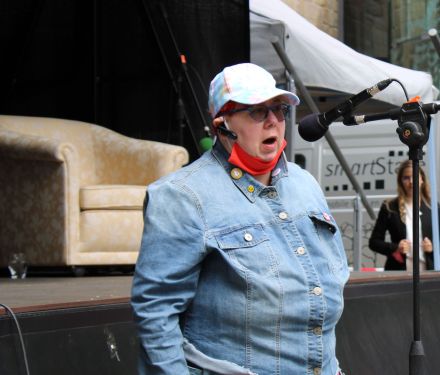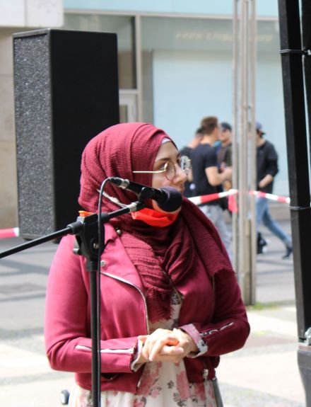 Cornela Wimmer vertrat auf der Bühne an der Reinolidikirche den eigentlich vorgesehenen OB-Kandidat der Dortmunder Linkspartei, Utz Kowalewski, der erkrankt war. Arme Kinder, so Wimmer, hätten oft schlechtere Schulmaterialien und Kleidung sowie kämen oft zu unangemessenen Zeiten in die Schule, weil etwa Alleinerziehende