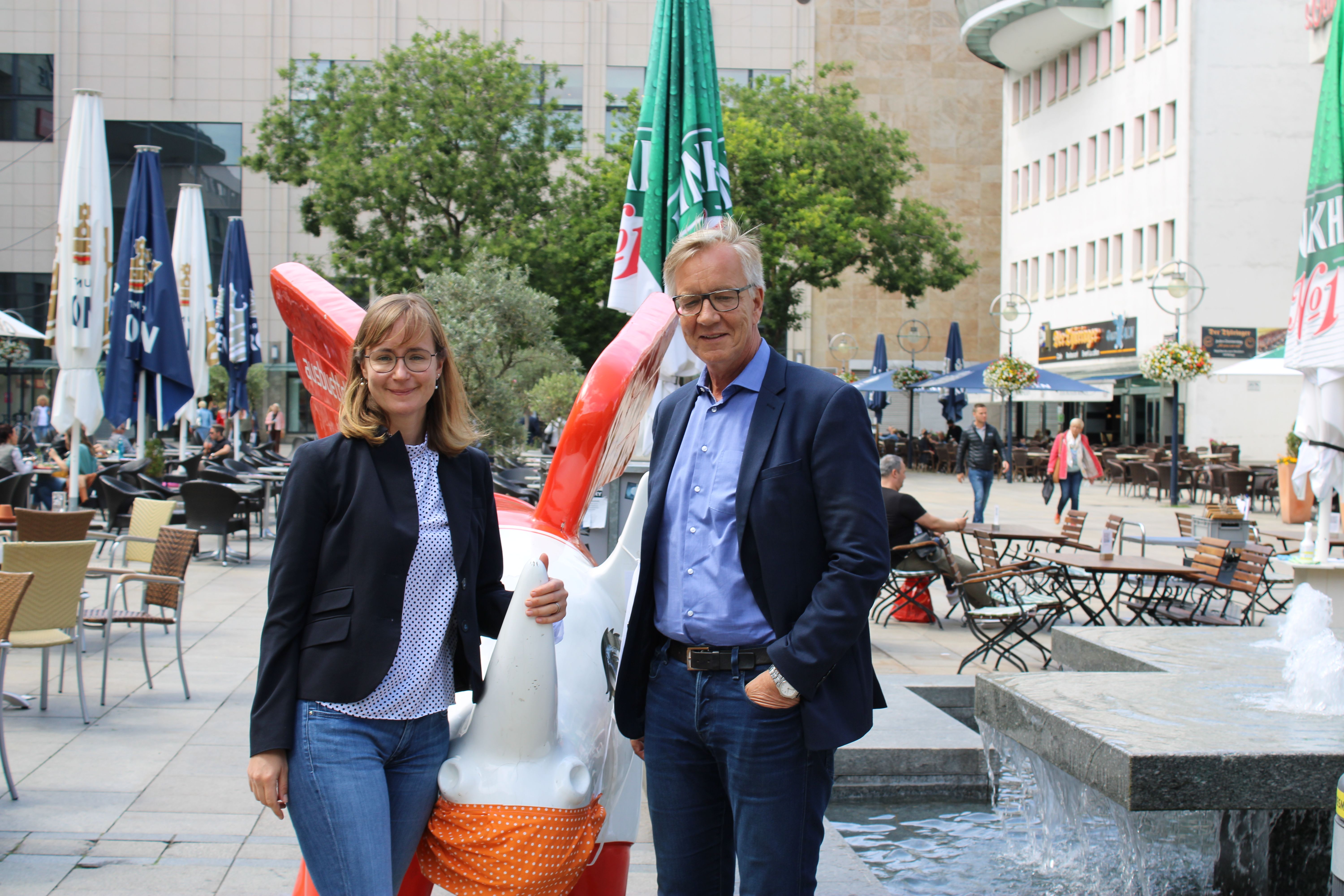 Eva von Angern im Dortmunder Stadtzentrum an einem der Nashörner, die für das Konzerthaus werben. Womöglich „tankten“ sie dort Kraft.