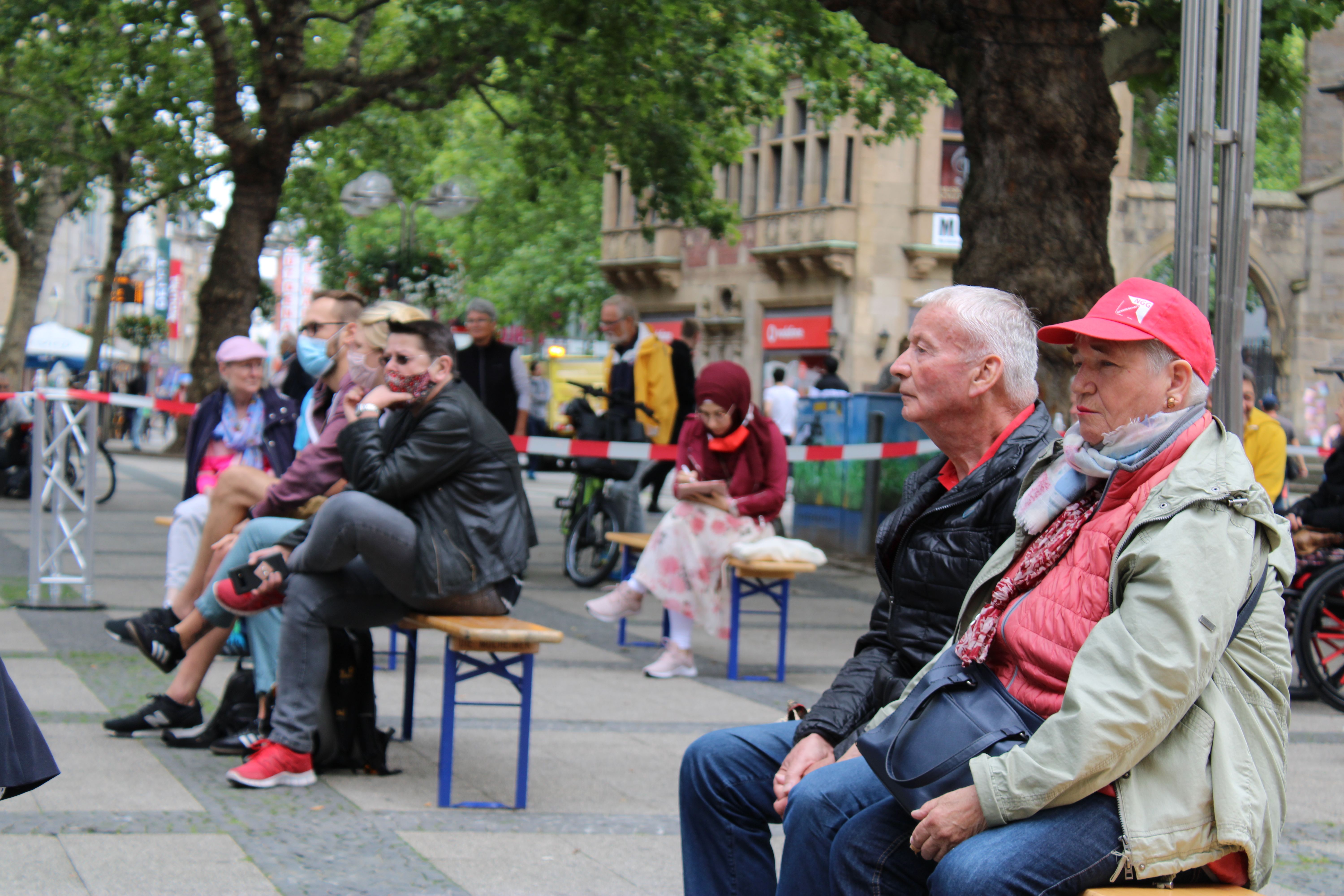 Eva von Angern, stellvertretende Fraktionsvorsitzende DIE LINKE. Fraktion im Landtags von Sachsen-Anhalt und zuständig für Rechts- und Gleichstellungspolitik, die Dietmar Bartsch auf seiner Reise durch NRW begleitet, befand das später auf der Diskussionsveranstaltung an der Reinoldikirche als zu wenig. In ihrer Heimatstadt Magdeburg, so von Angern, habe man immerhin jetzt 15 Kita-Sozialarbeiter*innen zur Verfügung.