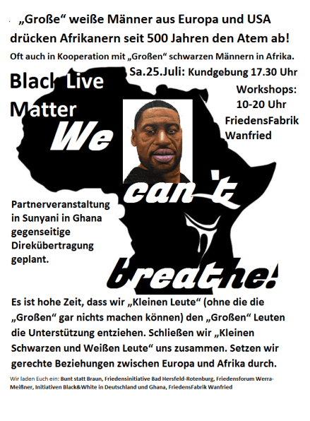 Die Workshops beginnen am 25. Juli 2020 um 10 Uhr. Um 17.30 Uhr gibt es eine Kundgebung mit der Gruppe Black&White gegen rassistische Gewalt und für friedliche, faire und solidarische Bedingungen zwischen Europa und Afrika. Geplant sich auch eine gegenseitige Live-Schaltung zur parallel stattfindenden Parallelveranstaltung in Sunyani in Ghana. Gemeinsam regen die Initiativen die Einrichtung von afrikanisch-europäischen (deutschen) Kommissionen zur Untersuchung der afrikanisch-europäischen Beziehungen in Gegenwart und Vergangenheit an als Grundlage für eine Versöhnung der Menschen beider Kontinente. Auf der ersten Seite der neuen Homepage der FriedensFabrik Wanfried stellt die Initiative ihre Friedenskonzeption vor. Weitere Videos sind zu den afrikanisch-europäischen Beziehungen (Sklavenhandel, Kolonialzeit) dort eingestellt und zur Wichtigkeit von Friedensengagement, dargestellt an einer Sichtweise persönlicher Betroffenheit: https://friedensfabrik-wanfried.com/die-einrichtung-von-wahrheits-und-versoehnungskommissionen/