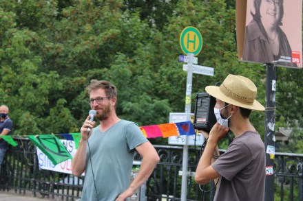 Der frühere SPD-Bundestagsabgeordnete und jetzt als fraktions- und parteiloser Bundestagsabgeordnete für seinen direkt errungenen Wahlkreis in Dortmund im Parlament arbeitende Marco Bülow ergriff nach der Rede einer XR-Aktivistin das Wort auf der blockierten Möllerbrücke.