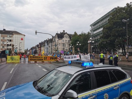 Die wenige Minuten nach Beginn der unangemeldeten Blockade mit mehreren Streifenwagen angerückte Polizei verhielt sich äußerst kooperativ. Auf die Polizei gingen auch die XR-Aktivist*innen zu. Sie meldeten eine Demo an. Es wurde zunächst vom Einsatzleiter der Polizei die Verlagerung der Kundgebung zum Sonnenplatz vorgeschlagen. Da aber der Verkehr mäßig war, ließ die Polizei die Aktivist*innen lange gewähren. Für nach 12 Uhr war die Räumung wenigstens einer Fahrspur im Gespräch.