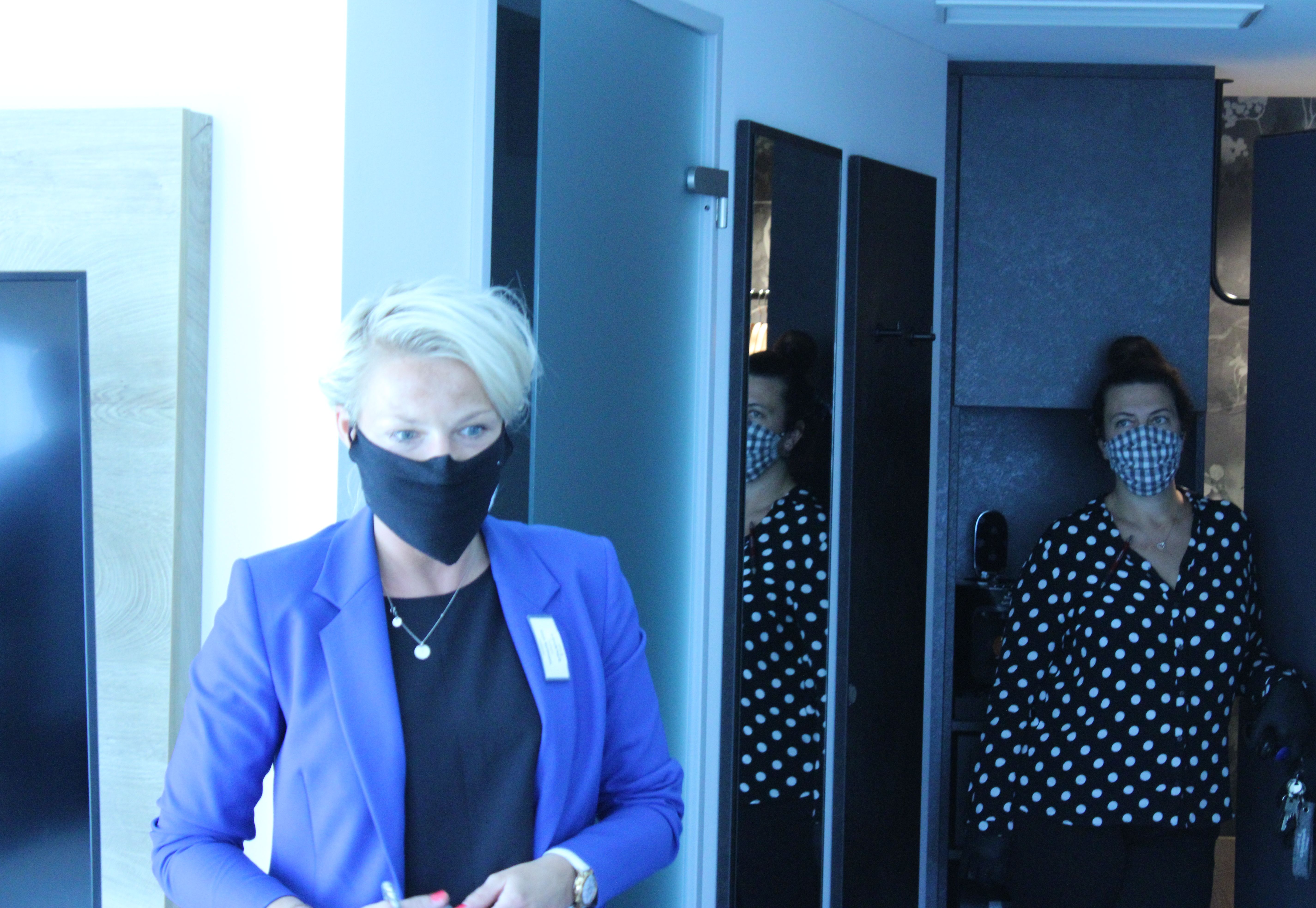 Die Hotelchefin zeigte das von ihr erarbeitete Hygienekonzept, das auch ein wenig humorvoll und mit flotten Sprüchen gestaltet wurde. Katja Kortmann: „Es geht um alles oder nichts.“ Man habe ca. 35 Mitarbeiter*innen und jetzt 97 Hotelzimmer sowie 18 Apartments. Die Bank sei bis jetzt kulant. Momentan muss man nicht tilgen. Aber das ginge ja schließlich nicht auf Dauer.