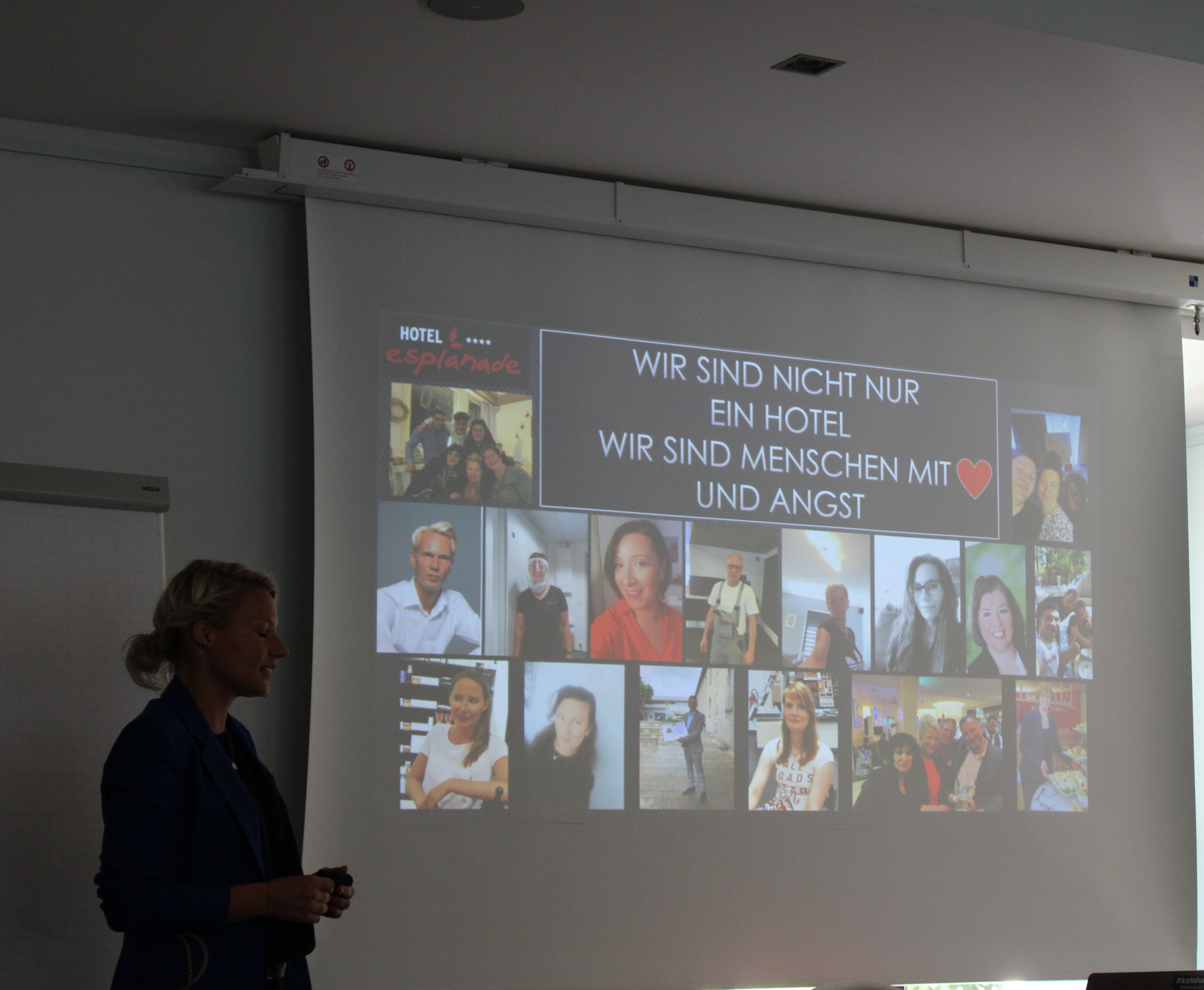 Die Medientour-Teilnehmer*innen trafen am Burgwall 3 auf die engagierte und zupackende Geschäftsführerin Katja Kortmann, die kurz vor der Corona-Krise zum Abschluss umfangreicher Modernisierungs- und Erweiterungsmaßnahmen die alleinige Geschäftsführung des Top Hotel Esplanade übernommen hat. Dann aber sofort vom Corona-Lockdown voll getroffen wurde.