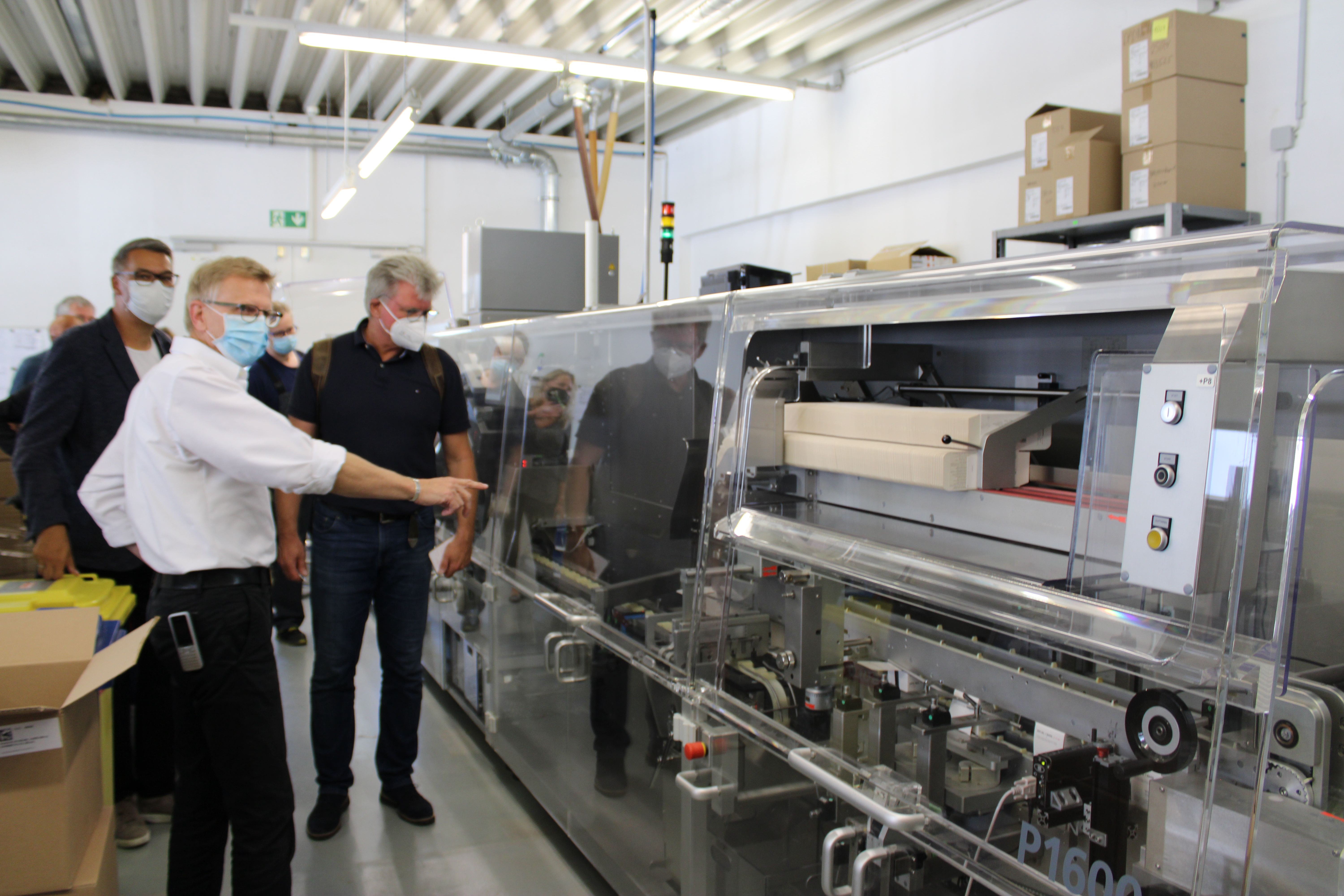 Dr. Elmar Grabert erklärte, dass es die Corona-Pandemie erfordert habe, in der Produktion geschützte Arbeitszellen für ein oder zwei Mitarbeiter*innen einzurichten. Des Weiteren ist Gleitzeit und ein dementsprechendes Schichtsystem eingeführt worden. Schutzmaßnahmen, wie sie später das Bundesarbeitsministerium herausbrachte, führte man frühzeitig ein. Alles