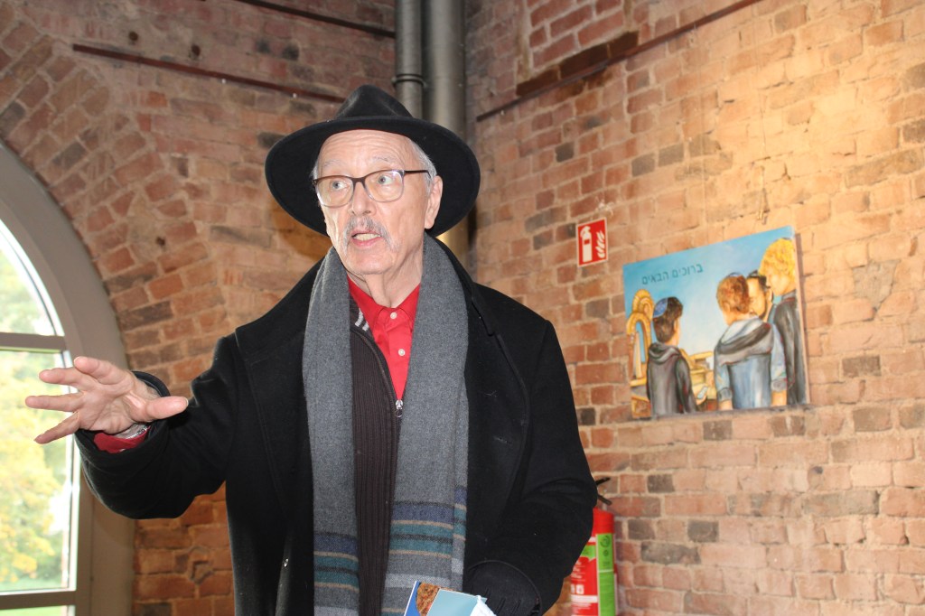 Für alle Besucher*innen schloss sich dem offiziellen Teil eine interessante Exkursion mit ganz besonderen Augenblicke an. Vor jedem Bild der Künstlerin wurde in Gruppen Station gemacht. Und diejenigen, welche zu den jeweiligen Bildern Texte oder Gedichte verfasst hatten – sie sind neben denen im Katalog abgedruckt – lasen diese vor. Waren einzelne Autoren nicht da, übernahm Tirzah Haase diese Aufgabe. So stellte sich zu den einzelnen Bildern noch einmal eine ganz besondere Verbindung her bzw. wurden Besucher*innen der Ausstellung interessante zu Gedanken angeregt. Der Kommunalpolitikers Friedrich Fuß, der einen Text zu Bettina Brökelschens Porträt von Benno Elkan (geb. am 2.12.1877 in Dortmund, gest. am 10.1.1960 in London) geschrieben hatte, las seinen Text persönlich. Fuß, erzählte übrigens, dass er ein Kunstwerk von Benno Elkan besitze. Es könne auf Anfrage bei ihm zuhause besichtigt werden. Elkan ist Mitbegründer des ersten Fußballvereins Dortmund (1995) sowie des Fußballvereins Bayern München. Nach ihm ist die Benno-Elkan-Allee in der Stadtmitte am Dortmunder U benannt. Ein Kunstwerk von Elkan kann man virtuell via Smartphone oder Tablet dort im Museum für Kunst- und Kulturgeschichte betrachten. Friedrich Fuß äußerte die an die Stadt Dortmund gerichtete Hoffnung, dass das Kunstwerk in naher Zukunft einmal in Bronze gegossen werde, um dann ausgestellt zu werden. Von Elkan stammt übrigens die große Menora vor der Knesset (dem israelischen Parlament) in Jerusalem.