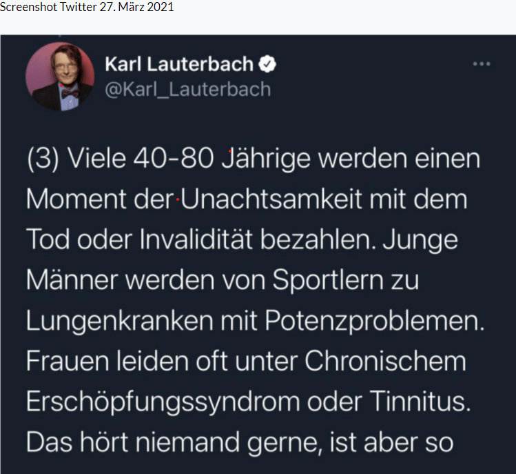 als Politiker der Regierungskoalition sind Sie prominenter Unterstützer von deren Corona-Politik. Immer wieder treten Sie mit extremen Meinungsbekundungen im Zusammenhang mit SARS-CoV2-Infektionen auf. Dabei nehmen Sie zumindest billigend in Kauf, in der Bevölkerung den Irrtum auszulösen, Ihre Äußerungen gründeten auf Ihrer ärztlichen Kompetenz oder auf ärztlicher Verpflichtung gegenüber dem Allgemeinwohl. Beispielhaft hierfür ist Ihr Tweet vom 26.3.21 (siehe Anlage):
