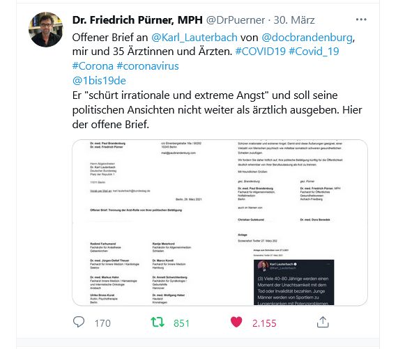35 weitere Mediziner unterzeichneten – gemeinsam mit dem Allgemeinmediziner Paul Brandenburg und dem Facharzt für Öffentliches Gesundheitswesen Friedrich Pürner – einen sogenannten Offenen Ärztebrief an Karl Lauterbach. Der SPD-Abgeordnete im Deutschen Bundestag Lauterbach ist in den letzten Monaten durch mediale Omnipräsenz und extrem pessimistische und panikschürende Äußerungen zum weiteren Verlauf der COVID-19-Pandemie durch das Coronavirus aufgefallen – oft ohne hinreichende Belege.