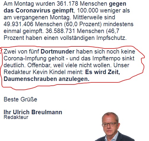 Redakteur der Ruhr Nachrichten passt das Impftempo nicht: „Es wird Zeit Daumenschrauben anzulegen“ (Kommentar eines Empörten)