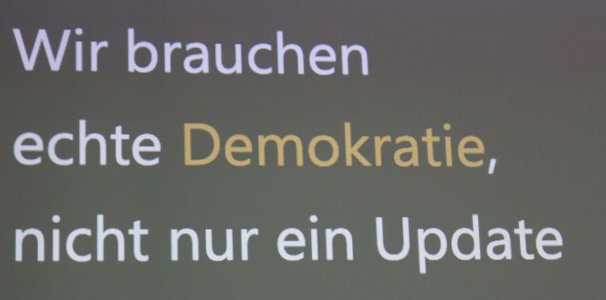 «Ein Ausfluss dessen sei, der Vortrag, welchen er nun präsentiere. Die wichtigste und umfangreichste Krise, welche uns am meisten treffen werde, sei die Klimakrise. Hinzu käme eine Sozialkrise. Des Weiteren sei eine Demokratiekrise auszumachen. Einher mit den anderen Krisenerscheinungen ginge momentan die Corona-Krise. Der Politiker zeigte sich sicher, dass wir nur aus diesen Krisen herauskämen, „wenn wir vor allem unsere Demokratie verändern, wenn ihr eine echte Demokratie schaffen“. Zu diesem Behufe müssten halt bestimmte Spielregeln verändert werden. Ansonsten seien die ganzen Krisen weder zu bewältigen noch zu überwinden.«