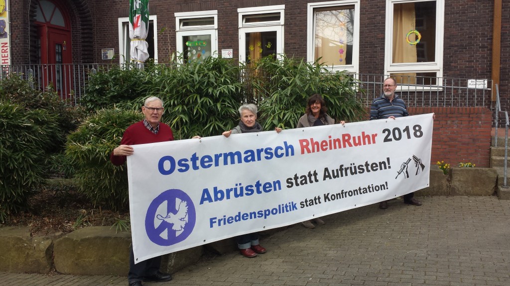Willi Hoffmeister – seit 50 Jahren für den Frieden engagiert – sprach zu den Ostermarschierern.Willi Hoffmeister (links) überreicht Werner Nass (rechts) eine Tafel mit Zeitungsausschnitten und Fotos. Foto: C. StilleDie Ostermarsch-Organisatoren (v.ln.r): Willi Hoffmeister, Cornelia Wimmer, Heike Dahlheimer (Leiterin Wichernhaus) und Joachim Schramm. Fotos: Claus StilleViele Jahrzehnte friedenspolitisch engagiert: Willi Hoffmeister (rechts).Friedensaktivist und Ostermarsch-Rhein-Ruhr-Veteran Willi Hoffmeister aus Dortmund.Zeitzeugen von damals: Ulrich Schnabel, Werner Nass, Willi Hoffmeister und Hans-Otto Wolf (v.l.) Foto: C. StilleFriedensaktivist Willi Hoffmeister (links) wird von Joyce Schröder interviewt.Georg Deventer (links) und Willi Hoffmeister (rechts) brechen dem Panzer das Geschützrohr ab. Fotos: Stille.