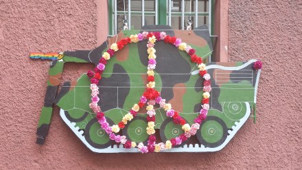 BotschafterInnen der Erinnerung und bunte Nelken in Form des Weltfriedenszeichens auf einem Panzer