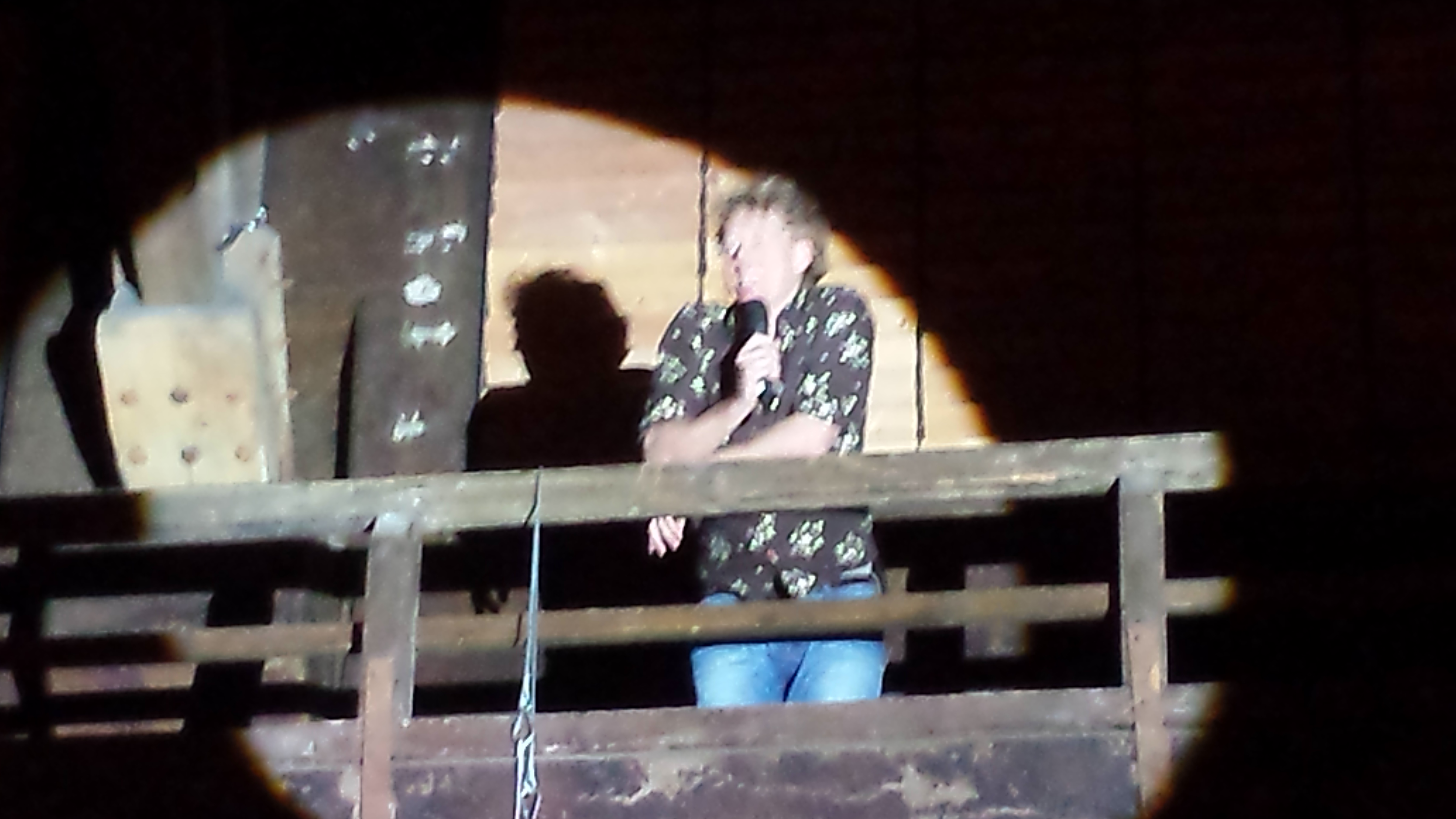 Eingangs der Show hätte sich freilich für Tjerk Ridder angeboten aus dem rechts neben der Bühne stehenden Campingwagen aufzutreten. Dann aber hatte man sich, wie wir von der begrüßenden Moderatorin Hella Sinnhuber erfahren, dazu entschlossen die sagenhaften örtlichen Gegebenheiten des Salzlagers zu nutzen. Eine grandiose Entscheidung! Plötzlich taucht Tjerk Ridder hoch droben mittig über der Bühne, fast unterm Dach der Location im scharfen Spot eines Scheinwerfers am Geländer eines dort verlaufenden seitlichen Stegs auf und begrüßt die Leute.