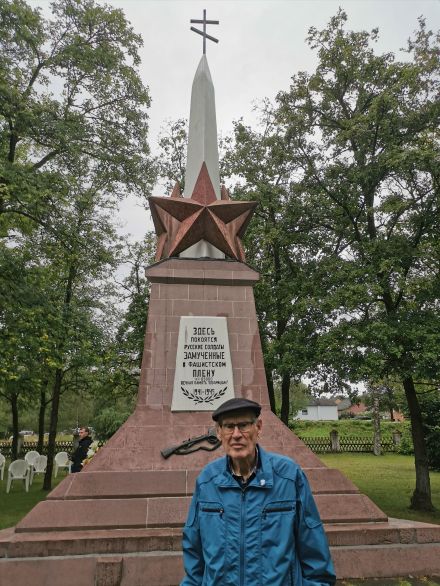 Beitragsbild: Sowjetischer Obelisk im einstigen Stalag 326 am Gedenkort in Stukenbrock. Davor ein unermüdlicher deutscher Kämpfer für Frieden und Freundschaft zur Sowjetunion und Russland, Willi Hoffmeister (verstorben im letzten Jahr)
